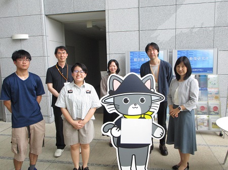 本研究については、データサイエンスサポーターの有志学生も協力者として参加しており、8月22日(木)に稲垣准教授、有志学生2名、データサイエンス教育研究センターの森由美特別任用教授がデータサイエンス共同利用基盤施設ならびに統計数理研究所を訪問して、施設見学および連携協定研究の打ち合わせを行いました。