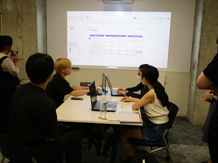 それぞれのグループで「誰に届けたいか」を具体化した「ペルソナシート」、そして対象者の感情面や背景をより深く考察するための「共感マップ」を作成し、どのような動画ならその対象者に届くのかを、NTTの方やセンター教員のアドバイスをいただきながら作成しました。発表の場では、誰を対象にしたか、何をテーマにしたか、ということが具体的に示され、試行錯誤のうえ作成した約30秒間の動画が上映されました。学生からは、「自分が想定したような画像、動画を生成するのが難しかった」「時期や小物など、細かい設定を表現するためのプロンプトに苦戦した」など、悩みながらもチームで協働して1つのものを作り上げる難しさや達成感を味わったようです。またNTT社員の方、そして教員からは、社会に出てからも「デザイン思考」が重要になること、そしてAIが出来ることと出来ないことをきちんと認識したうえで、AIをどのように使用するかを考えることが重要である、との講評をいただき、盛況のなか2日間のワークショップが終了いたしました。