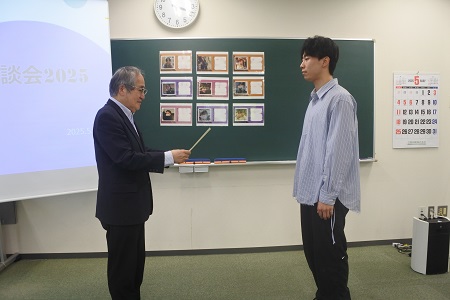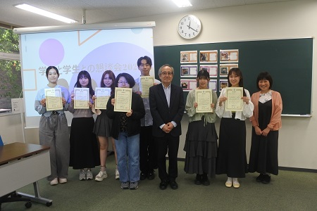 懇談会の冒頭には、学長から、多くの新入生の時間割相談に応じてくれたことに関する謝辞が述べられた後、在学生コーチに対して感謝状が授与されました。その後、食事をしながら活発な意見交換が行われ、在学生コーチからは、新入生が時間割相談の他、「留学」、「キャリア」や「教職課程」等について質問が多く寄せられたことについての報告があり、次年度以降は、これらの疑問に答えられるよう他部署と連携を取ることの提案や、当日の待ち時間削減を目的に事前Web予約ができるかについても検討したい等、前向きな意見が寄せられました。