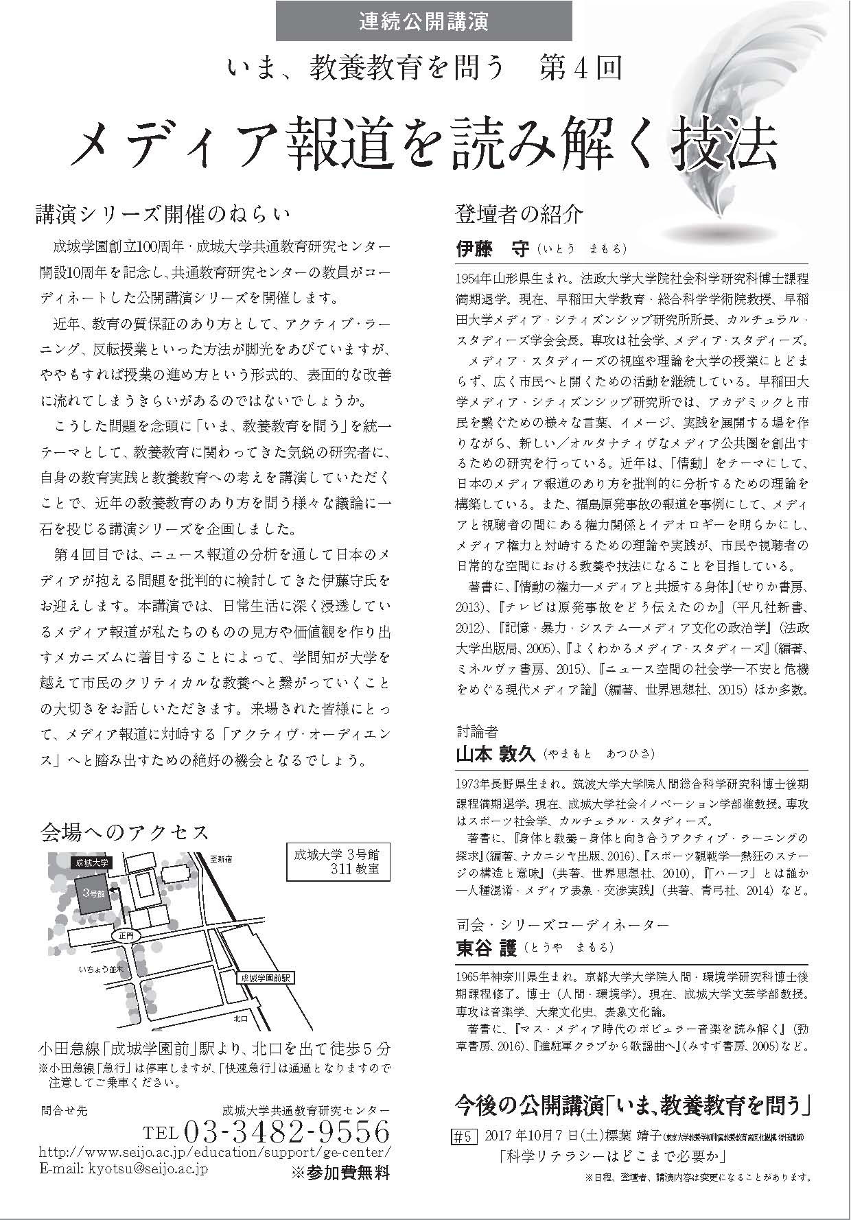 第4回目では、ニュース報道の分析を通して日本のメディアが抱える問題を批判的に検討してきた伊藤守氏をお迎えします。本講演では、日常生活に深く浸透しているメディア報道が私たちのものの見方や価値観を作り出すメカニズムに着目することによって、学問知が大学を越えて市民のクリティカルな教養へと繋がっていくことの大切さをお話しいただきます。本講演は、メディア報道に対峙する「アクティヴ・オーディエンス」へと踏み出すための絶好の機会となるでしょう。