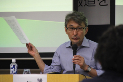 講師にお迎えしたのは早稲田大学教授の伊藤守氏。「メディア報道を読み解く技法」という講演タイトルでしたが、伊藤氏はメディア報道が私たちのものの見方や価値観に大きく影響を及ぼしていることから、「人文社会情報学」という視点の重要性を説き、情報とメディアに関する教養教育の必要性についてお話しされました。