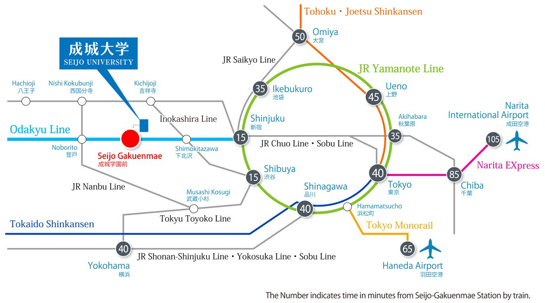 It takes about fifteen minutes on the Odakyu Line express or semi-express from Seijo Gakuenmae Station to Shinjuku Station.Seijo University is a five-minute walk from the station.