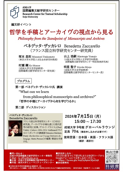 成城大学国際編集文献学研究センター主催イベント「哲学を手稿とアーカイヴの視点から見る」を下記の要領で開催いたします。ポール・ヴァレリーやモーリス・メルロ=ポンティのテクスト編集に携わられたベネデッタ・ザッカレロ氏(フランス国立科学研究センター研究員)にご講演いただきます。講演後は、塚本昌則先生(東京大学教授)、山上浩嗣先生(大阪大学教授)、村瀬鋼先生(本学文芸学部教授)をお招きし、当センター長 明星聖子先生(本学文芸学部教授)を交えてディスカッションを行います(日本語翻訳・通訳付)。詳細は下記をご覧ください。