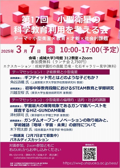 成城大学研究機構グローカル研究センターは、「第17回 小型衛星の科学教育利用を考える会」を共催します。ぜひご参加ください。 日時:2025年3月7日(金)10:00~17:00 場所:成城大学3号館1階 312教室 (〒157-8511 東京都世田谷区成城6-1-20) 成城大学へのアクセス 参加費:無料 なお、プログラムはポスターにてご確認ください。