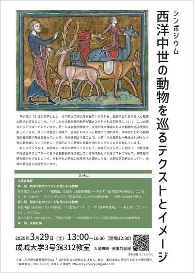 科学研究費基盤研究(C)「13世紀前後の西欧における人、動物、動物表象の関係性を巡る学際的研究」表象班は、シンポジウム「西洋中世の動物を巡るテクストとイメージ」を開催します。