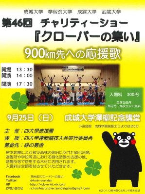 四大學應援團主催第46回チャリティーショー『クローバーの集い』が、以下のとおり開催されます。