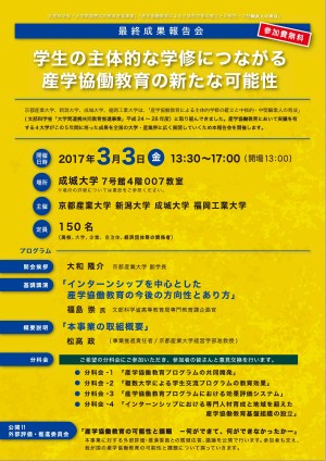 京都産業大学、新潟大学、成城大学、福岡工業大学は、「産学協働教育による主体的学修の確立と中核的・中堅職業人の育成」(文部科学省「大学間連携共同教育推進事業」平成24年~28年度)に取り組んできました。産学協働教育において実績を有する4大学がこの5年間に培った成果を全国の大学・産業界に広く展開していくために本報告会を開催します。