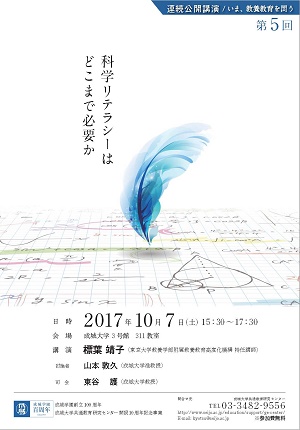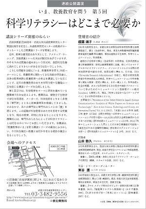 第5回目では、科学教育をテーマに研究を進めている標葉靖子氏をお迎えします。標葉氏は、植物分子生物学で学位を取得後、メーカーで、科学技術をとりまく多様な「専門家」とともに新事業開発を推進してきました。そのなかで、各々の専門知と専門外の人々との「壁」を感じます。この経験が科学教育のあり方を思考する契機となり、現在の教育、研究に向き合うことになります。標葉氏には、専門外の人たちにとっての科学リテラシーとは何なのかについてお話しいただきます。本講演は、「教養教育のいま」を問う講演シリーズの最後にふさわしい、今日的な幅広い教養とは何かを考える絶好の機会となることでしょう。