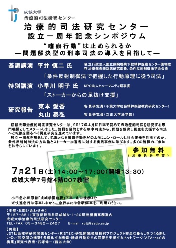 設立一周年を記念して、犯罪となる嗜癖行動をどのようにコントロールし社会復帰を目指すのか、条件反射制御法の方法論とストーカー加害者に対する実践事例に学びます。多くの皆様のご参加をお待ちしています。