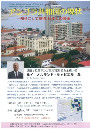 経済学部の境新一教授研究室協力により、NPO法人 日本・アンゴラ協会主催の講演会「アンゴラ共和国の現状 ~知ることで納得、日本との関係~」を成城大学にて開催いたします。申込み不要で、どなたでも参加できます。