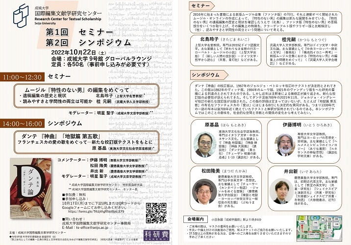 国際編集文献学研究センター主催の第1回セミナー、第2回シンポジウムを下記の要領で開催いたします。セミナーでは、北島玲子先生(上智大学名誉教授)と桂元嗣先生(武蔵大学人文学部教授)をお招きして「ムージル『特性のない男』の編集をめぐって」を共通テーマにご講義いただきます。また、シンポジウムでは、原基晶先生(東海大学文化社会学部准教授)に「ダンテ『神曲』「地獄篇 第五歌」フランチェスカの愛の歌をめぐって-新たな校訂版テクストをもとに」と題して、ご講演いただきます。コメンテーターには、伊藤博明先生(専修大学文学部教授)、松田隆美先生(慶應義塾大学文学部教授)、井出新先生(慶應義塾大学文学部教授)をお迎えします。