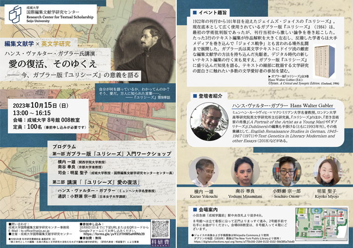 成城大学国際編集文献学研究センター主催 ハンス・ヴァルター・ガブラー氏講演「愛の復活、そのゆくえ——今、ガブラー版『ユリシーズ』の意義を語る」プログラム変更のお知らせ
