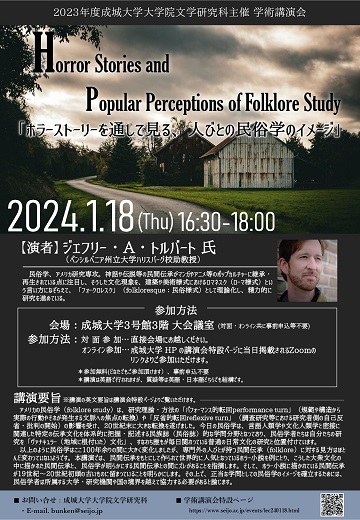 以上のように民俗学はここ100年余りの間に大きく変化しましたが、専門外の人びとが持つ民間伝承(folklore)に対する見方はほとんど変わっていないようです。本講演では、民間伝承をもとにして作られて世界的に人気となっているホラー小説を例にとり、こうした大衆文化の中に描かれた民間伝承と、民俗学が明らかにする民間伝承との間にズレがあることを指摘します。そして、ホラー小説に描かれている民間伝承が19世紀~20世紀初頭の古いものに留まっていることを明らかにします。その上で、正当な学問としての民俗学のイメージを確立するためには、民俗学者は所属する大学・研究機関や国の境界を越えて協力する必要があると論じます。