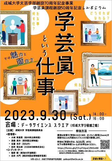成城大学文芸学部創設70周年記念事業 学芸員課程創設50周年記念シンポジウム「学芸員という仕事 その魅力と面白さ」を下記の通り開催いたします。