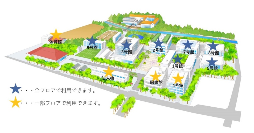 大学内の以下の場所に無線LANアクセスポイントを設置しています。持ち込みPC等を無線LANに接続して利用することができます。接続設定は各自で行っていただきます。マニュアルはホームページや各施設にご用意しておりますので、ご参照ください。