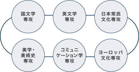 文学研究科は、文芸学部6学科を基盤とした6専攻により構成され、各専攻にはユニークな学問研究を行っている著名な教員がおります。院生は各教員のもとで研究を行いますが、立場を越えて「共に学ぶ」という姿勢が本研究科の特色になっています。