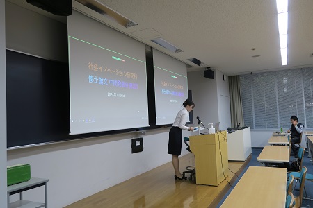 社会イノベーション研究科では、修士論文を提出しようとする博士課程前期2年次の学生は、その作成にあたり、各学期に1回ずつ開催される中間発表会で途中経過を報告することとなっています。