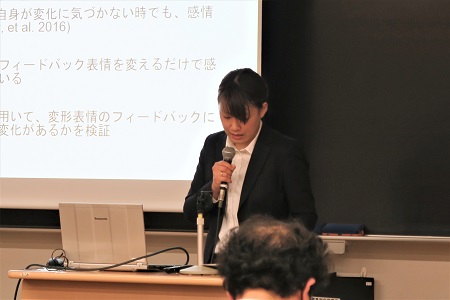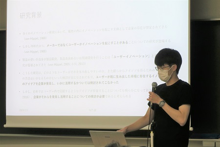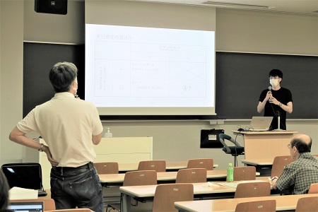 当日は、学生2名が、それぞれ15分の持ち時間で、自身の研究について報告を行いました。