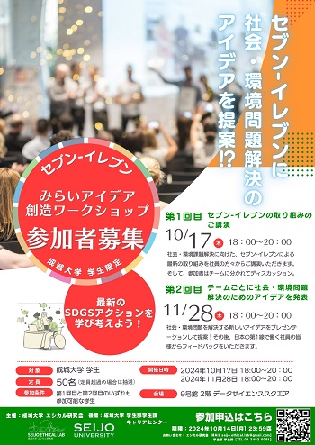 2024年10月17日(木)および11月28日(木)に、株式会社セブン-イレブン・ジャパンのご協力のもと、本学の課外活動団体であるエシカル研究会の主催(学生部・キャリアセンター共催)により、「みらいアイデア創造ワークショップ」を開催しました。