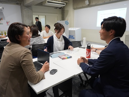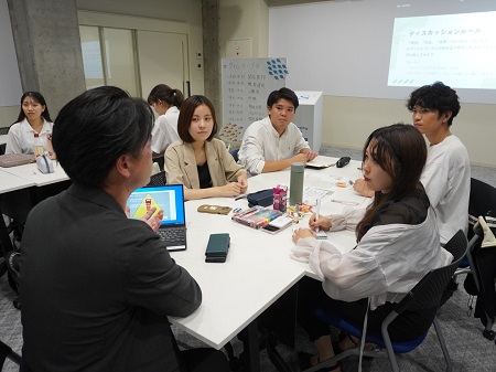 本ワークショップは、全2回の構成となっており、第1回(10月17日)は、セブン-イレブン・ジャパン サステナビリティ推進室 総括マネジャーの吉田 希美枝氏、商品本部 次世代商品開発 シニアマーチャンダイザーの赤松 稔也氏、企画本部 みらい事業創造部 新規事業開発 副総括マネジャーの大嶋 健一氏から、それぞれセブン-イレブン・ジャパンの取り組みについてご講演をいただいた後、学生たちはグループに分かれて、アイデア提案に向けたディスカッションを社員の方々を交えて行いました。