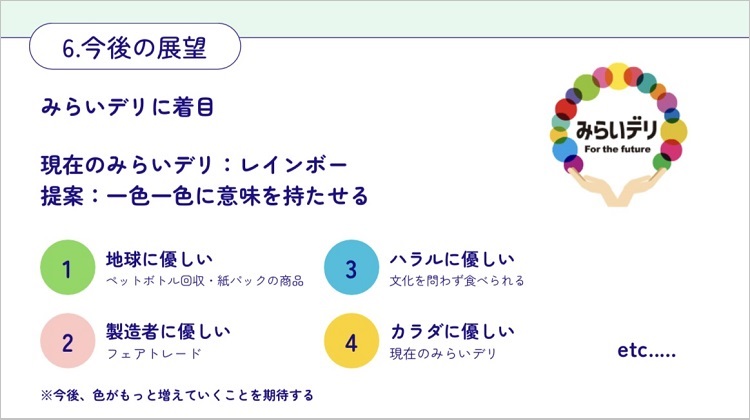 私たちのチームはムスリムをターゲットとし、ハラル対応の商品を視覚化すること、そしてみらいデリのマークの一色一色に意味を持たせるようなみらいデリのリメイクの2点を提案しました。企画を考える時に、実際にムスリムの方にインタビューしたり、セブン‐イレブンさんの理念である「みんなを笑顔に」を達成できるような企画を提案しました。