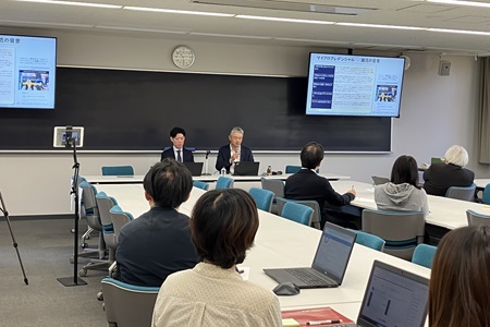 当日は、一般財団法人オープンバッジ・ネットワーク事務局より、常務理事 事務局長の吉田俊明様と内田友亮様を講師としてお招きしました。説明会には、現在オープンバッジを発行している部署や、今後発行を予定している部署の教職員が参加しました。
