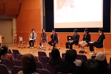 トークイベントの後半では、成城学園高等学校3年生の生徒3名が加わり、6名でのパネルディスカッションを行いました。高校での探究学習をきっかけにLGBTQ+の方々を取り巻く社会課題に関心を抱いたという川嶋洵生さん、川嶋さんの影響で同様の関心を深めた田島明空さん、中野壮太さんが登壇し、写真とメッセージによるアート作品を題材に意見交換を行いました。「発信者の意図と受け取り手の感じ方の違い」について、年齢や立場を超えた活発な議論が交わされました。