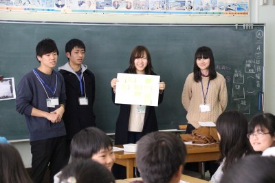 「勉強は大変ですか?」「部活での上下関係は厳しいですか?」など、中学生生活に関しての質問に大学生が自分たちの経験を踏まえながら説明。ゼミ生には成城学園中学校高等学校を卒業した学生が6人おり、より詳しく説明ができました。また、事前に大学にいる4人の先生や職員に中学・高校時代に何に打ち込んでいたかをインタビューし、それを子どもたちに発表。最後はグループ別に「中学生になったら頑張りたいこと」を小学生に考えてもらい、それをまとめて報告しました。