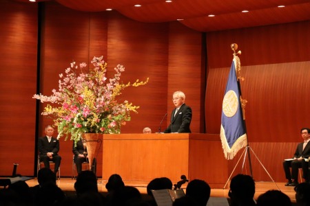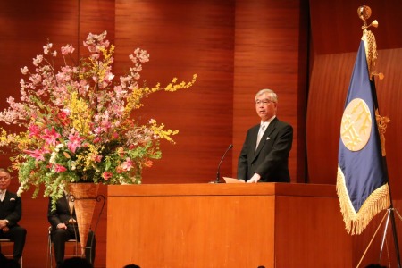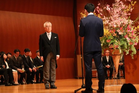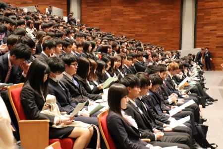戸部学長の式辞の冒頭は、ささやかな伝統となっている“エール交換”。学長から「おめでとう」と呼びかけ返事を促すと、新入生たちは「ありがとうございます」と応えました。そして、「このエール交換で仲間になった」新入生たちへ、「互いの弱点を補い合える友を見つけ、どんなことでもいいから懸命に取り組んでほしい」と激励の言葉を送りました。新入生代表の答辞は、これに応えるよう「次世代を担う者として皆様の期待に応えられるよう懸命に励んでいきたい」と強い決意が語られました。