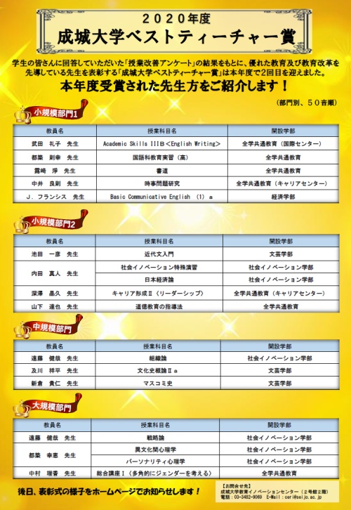 本学では昨年度より、学生が回答する「授業改善アンケート」の結果をもとに、優れた教育及び教育改革を先導している教員を表彰する「成城大学ベストティーチャー賞」を創設しています。