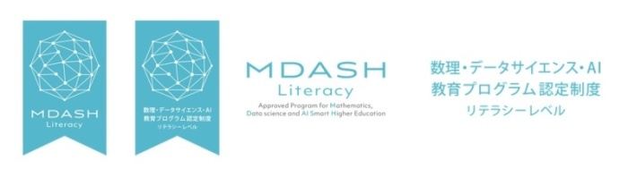 この認定制度は、今年度から開始されたもので、数理・データサイエンス・AIに関する知識及び技術について体系的な教育を行うものを文部科学大臣が認定及び選定して奨励することにより、数理・データサイエンス・AIに関する基礎的な能力の向上を図る機会の拡大に資することを目的とするものです。認定されると下に示す認定ロゴを掲げることができます(MDASH : Approved for Mathematics, Data science and AI Smart Higher Education)。