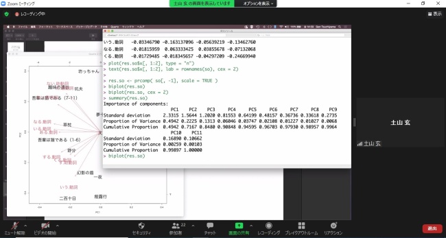 8月19日(木)・20日(金)の2日間、お茶の水女子大学 文理融合AI・データサイエンスセンター 特任講師の土山 玄(つちやま げん)先生を講師にお迎えして、「文学作品のテキストマイニング-データサイエンスが解き明かす作品の痕跡-」というテーマで、データサイエンス・ワークショップをZoomによるオンライン方式で開催しました。初めての試みでしたが、2日間にわたり約20名の本学学生・大学院生が参加しました。