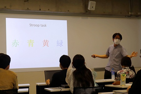 講義編では「我々にとって言語とは何か」という問いから、人間の高度な認知機能に欠かせない「予測」と、誤った判断・解釈に対する「抑制」の働きに焦点をあて、言語認知について学びました。受講者は言語が脳内で処理される際の負荷をテストする「Stroop task」にも取り組み、普段無意識に行っている「認知」について体験的に学ぶことができました。
