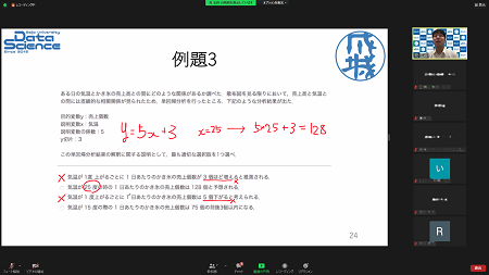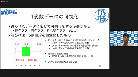 9月2日、今年度の初回講習会として「事前数学講習会」が行われました。データサイエンス教育研究センターの玉谷 充専任講師による約3時間(2・3時限)の講義で、ベクトル・行列、微積分、確率・統計について「G検定」の問題に対応できる基礎知識を身につけることを目指しました。「G検定」の過去問題を例題として用いながら、正解だけでなく、誤答のどの部分が違うのかといった細かい説明もあり、着実に知識が定着するように配慮されていました。また、数学・統計学と深層学習の関連についても解説され、「本講習」に向けた導入としても有意義な時間となりました。