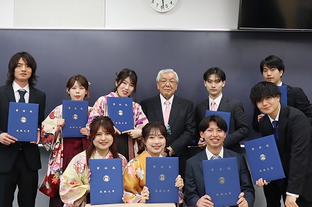 杉本学長の式辞では、「成城大学で学んだことについて振り返ってみましょう。」ということで、AIを中心としたデジタル時代に重要になる批判的思考力、多様性を認め合意形成を図るための対話力、失敗しても次への指針を見出す振り返りの能力をあげ、「4年間で身につけたそれらの力を、卒業を機に『棚卸し』してみてください。そして自信をもって次のステージに進んでください。ボンボヤージュ。良い旅を」との門出を祝う言葉が述べられました。さらに、人生100年時代にあって学び続けることの大切さに触れて、成城大学は卒業生のリスキリングもサポートしていくとして、卒業後も途絶えることのない母校と卒業生の絆が示されました。