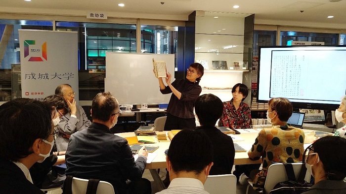 第2回は「巻子本と冊子本 —中世—」と題して、文芸学部国文学科山田 尚子准教授が担当しました。事前に予約された方、第1回講座にもご参加いただいたリピーターのほか、オープンスペースのため当日お立ち寄りいただいた方々も多く、約30名に参加いただきました。