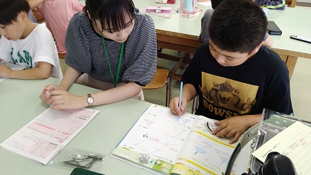学習室では小学4年生を対象とし、算数の基礎・復習、宿題サポートを行います。6月14日(水)に初回が開催され、28名の4年生児童が参加しました。本学からは、3名のボランティア学生が入り、ドリルやプリントの丸付けを行ったり、手が止まっている子に積極的に声がけしたり、ワイワイと楽しい雰囲気で放課後学習の時間を進めていました。学習のサポートに限らず、普段の生活の話等の雑談などにも花が咲き、「このあと〇〇君と児童館に行くけど、今度一緒に行こうよ!」など、児童館へのお誘いを受けた学生もいました。参加した児童からは、「楽しかった!」「また次回も来る!」「みんなでやると勉強が進むなぁ。」といった言葉を帰りがけにもらい、全体で楽しい時間を過ごすことができました。