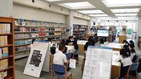 101名と大人数での来館となったため、館内3か所に分かれてガイダンスを行いました。図書館職員からは、20分程度で施設紹介、利用方法、資料の検索方法等が説明され、その後20分程度で館内を自由に見学いただきました。