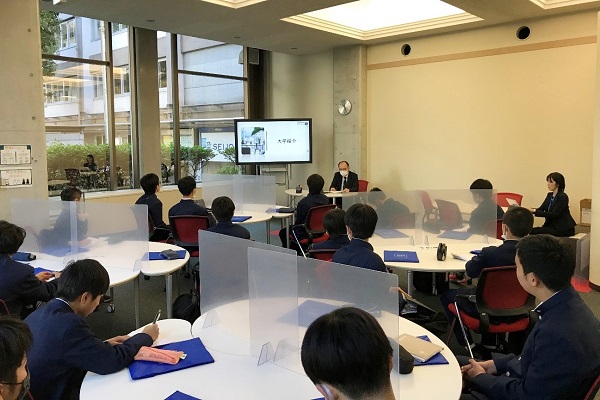 本学からは、大前提として大学とはどのような基準で設置されているのか、簡単に学校教育法、私立学校法、設置基準の話題を提供し、その上で、成城大学の教育理念や特徴について大学案内パンフレットを用いながら説明しました。中学1年生の皆さんにとっては慣れない言葉が多く、まだ大学をイメージすることは難しいかとも思いましたが、「学生が先生に進路相談をすることは可能か」「留学にはどのような制度があるのか」「大学院は大学とどのように違うのか」といった具体的な質問も頂き、メモを取ったりパンフレットを読みこんだり、真剣に参加してくれていました。
