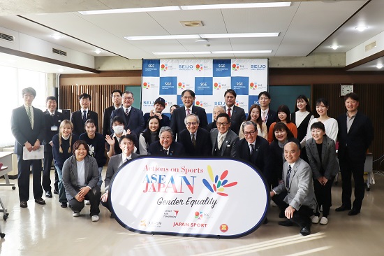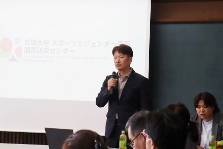 飯塚俊彦委員長のご挨拶、杉本義行学長挨拶に続き、SGEセンター長の山本敦久 社会イノベーション学部教授、副センター長野口亜弥 文芸学部専任講師より、SGEの事業概要について説明をしました。山本センター長はSGE設立の背景や課題、設立の目的、活動内容等について紹介し、ジェンダー平等実現のためのプラットフォームとなるよう研究を推進していきたいと語りました。野口副センター長は、東南アジアを中心としたこれまでの活動について詳細に説明し、幼稚園から大学院までの一貫教育を行う成城学園の特性を活かし、スポーツとジェンダーの問題への取り組みを学園全体でけん引していけたら、と展望が語られました。さらに、東南アジアをはじめ世界で女性がどのように活躍するか、女性がさらにスポーツに進出するにはどうしたらよいか、研究を通じて国際的に発信していきたいと述べました。