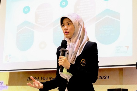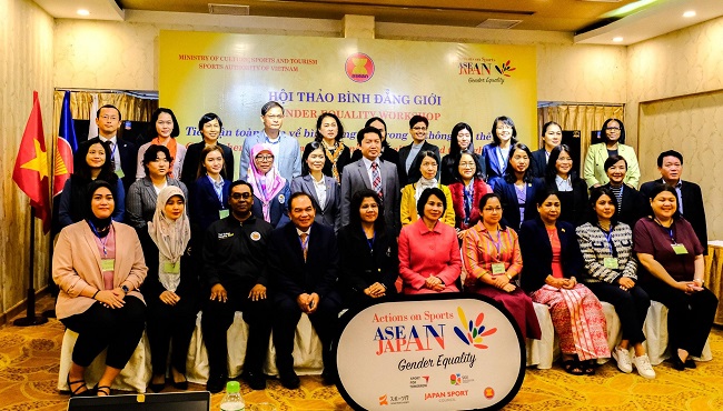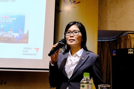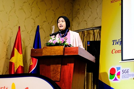 初日のオープニングは、共催ホスト国であるベトナムの Viet Nam Sports AuthorityからチェアマンのDang Ha Viet氏による開会の挨拶で始まりました。続いて、本ワークショップの主催者である成城大学のスポーツとジェンダー平等国際研究センター(International Research Center for Sport and Gender Equality:SGE)から副センター長の野口亜弥が挨拶を行いました。野口は、ワークショップ開催実現への感謝の意を表した上で「スポーツにはジェンダー問題を乗り越えるポテンシャルがある」と、今回のワークショップがスポーツにおけるジェンダー平等達成に向けた主要な原則に対するアプローチを議論する機会となることへの期待を示しました。さらに、ASEAN事務局のSenior Officer of Education Youth and Sports DivisionのLarasati Indrawagita氏は「スポーツは、ジェンダー平等を促進し女性や女の子に力を与える強力なプラットフォームとなる」と話し、ワークショップを通じた議論がジェンダーの視点を取り入れた各国のスポーツ政策策定の後押しとなるよう、期待を込めて開会の挨拶としました。