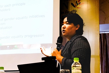 第1セッションでは、SGE副センター長であり、成城大学文芸学部専任講師の野口が「Introduction of Gender Mainstreaming & Gender Issues in Sport(スポーツにおけるジェンダー主流化とジェンダーの課題)」のテーマを担当しました。冒頭に、2021年から2025年までの「ASEAN-Japan Actions on Sports: Gender Equality」プロジェクトの背景とこれまでの取り組みを解説しました。2021年に実施した第1回目のワークショップで各国が特定した、スポーツにおけるジェンダー平等を推進するための政策策定に向けたアクションポイントを振り返りながら、スポーツ政策の中でジェンダーに特化した取り組みがこれまでほとんど行われてこなかったことを共有しました。その上で、ASEAN諸国のスポーツにおけるジェンダー平等を推進するために、今回のワークショップのテーマでもある「ジェンダー主流化」に取り組むことの重要性を説きました。また、「Equality(平等)」と「Equity(公平)」の違いについても説明。社会的構造の結果として生まれたジェンダー課題にアプローチする時、すべての人に同様の機会や資源を与える「Equality(平等)」ではなく、その構造の中で脆弱な立場に置かれる人たちの状況に合わせた特定の必要機会や資源を提供する「Equity(公平)」の観点を持つことの必要性を強調しました。