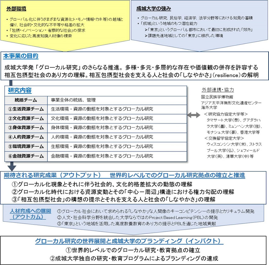 本事業は、成城大学が世界に先駆けて開始したグローカル研究の蓄積を基に、多様・多元・多層的な存在や価値観の併存を許す「相互包摂型社会」のあり方を提示するとともに、それを支える人と社会の「しなやかさ」(resilience)の解明を目的とする。また、その成果を本学が伝統とする高度教養教育に還元し、来たるべき未来社会においてしなやかに生き、活躍する「しなやか人材」の育成をも担う世界的なグ