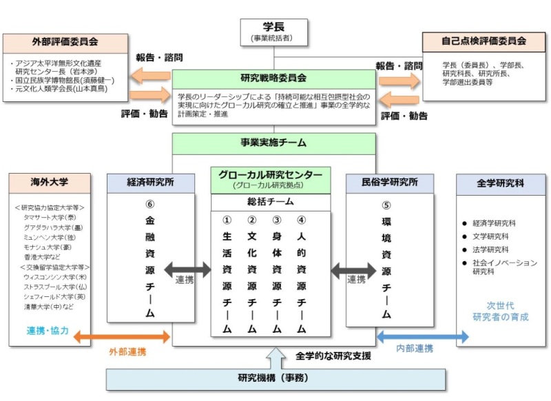 本事業は上述の研究戦略委員会が管轄し、本学が世界に先駆けて進めてきたグローカル研究を本学の研究の柱とすることを目的に実施するものであり、グローカル研究の中枢であるグローカル研究センターと民俗学研究所、経済研究所とが一体となって取り組む。また、研究戦略委員会における学長の指示のもとに本学大学院の4研究科(経済学研究科、文学研究科、法学研究科、社会イノベーション研究科)との連携も図りつつ事業計画を策定し、全学的な規模を担保したうえで推進することとしている。以上のような全学的な事業の推進は、グローカル研究を担う新たな人材育成のための環境を再整備することも視野に収めたものである。なお、研究戦略委員会が所管する事務部署として研究機構事務室があり、本事業の事務的な支援は当事務室が担当することになる。