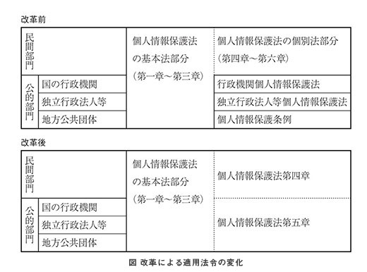 今回の改革により、民間部門と公的部門のすべてについて、個人情報保護法(新法)が適用されることになった。同法の基本法部分がすべての部門に適用される点は変わっていない。他方で、民間部門については同法の第四章が、公的部門(国の行政機関、独立行政法人等、地方公共団体、地方独立行政法人)については同法第五章が、それぞれ適用される(図参照)。