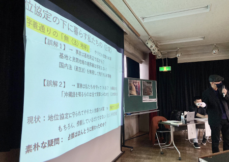 なお、前日の7日には関連企画として「TACHIの痕跡と立川の現状をめぐるフィールドワーク」を高原の案内で実施し、旧米軍立川基地跡地(現・昭島地区留保地)の現状を巡検しました。また、9日には立川市砂川町の砂川学習館において、市民団体「砂川平和ひろば」との共催で講演会「砂川/沖縄から問う 移駐と復帰50年」を高原の司会で開催しました。同講演会については、東京新聞で事前に報道がありましたので、ご参照下さい。