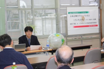 2017年3月21日(火)15時より16時半まで本学経済研究所において、「日系企業のグローバル化とトランポノミクス - メキシコ経済への影響 -」をテーマとするミニ・シンポジウムが本学経済研究所と私立大学研究ブランディング事業との共催で行われた。当日は本学社会イノベーション学部内田真人教授が司会を務め、グアダラハラ大学経済経営学部の柿原智弘による報告が行われた。