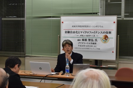 2018年10月23日(火)に本学経済研究所において、「金融自由化とマイクロファイナンスの役割 — メキシコのケース —」をテーマとするミニ・シンポジウムが本学経済研究所と私立大学研究ブランディング事業との共催で行われた。当日は本学経済学部福光寛教授が司会を務め、グアダラハラ大学経済経営学部の柿原智弘による報告が行われた。