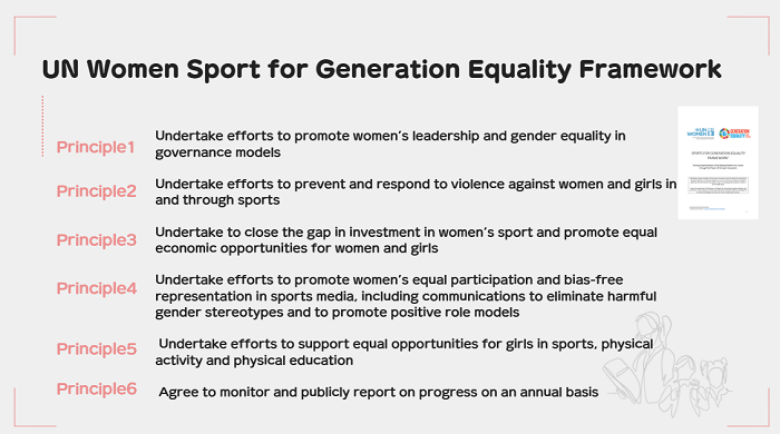 Furthermore, she explained that the data we can collect can be categorized into two types: "qualitative data," which captures the characteristics, descriptions, and qualities of phenomena, and "quantitative data," which is numerical information that can be measured, calculated, and statistically analyzed. Subsequently, she touched upon specific examples of indicators for measuring each principle of UN Women's "Sport for Generation Equality Framework."