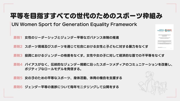 また、収集できるデータには、現象の特徴や説明、質を捉える「質的データ」と、測定や計算、統計的に分析できる数値情報である「量的データ」の2種類があることを解説しました。その上でUN Womenの「Sport for Generation Equality Framework」の各原則を測定するための指標の具体例について触れました。